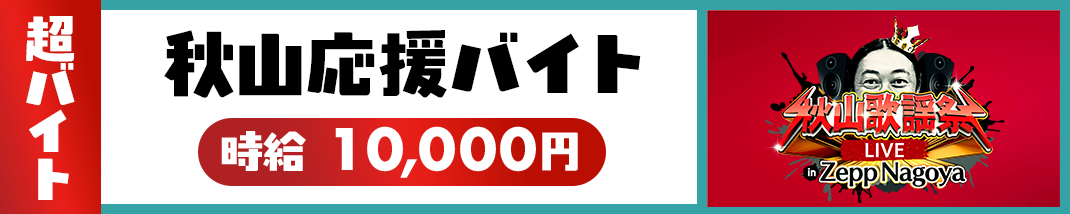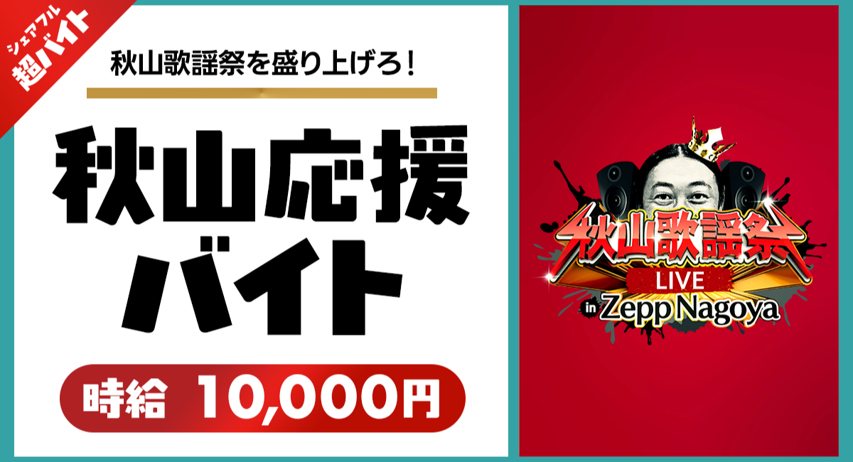 今回の超バイト企画では、2025年9月23日(火・祝)にZepp Nagoyaで行われる、メ〜テレ特番『秋山歌謡祭』のライブイベント『秋山歌謡祭LIVE in Zepp Nagoya』にてリハーサルの見学や撮影補助など、ロバート秋山をサポートするアルバイトを募集します。「ライブを一緒に盛り上げたい」「秋山さんを応援したい!」という方は、ぜひご応募ください!
