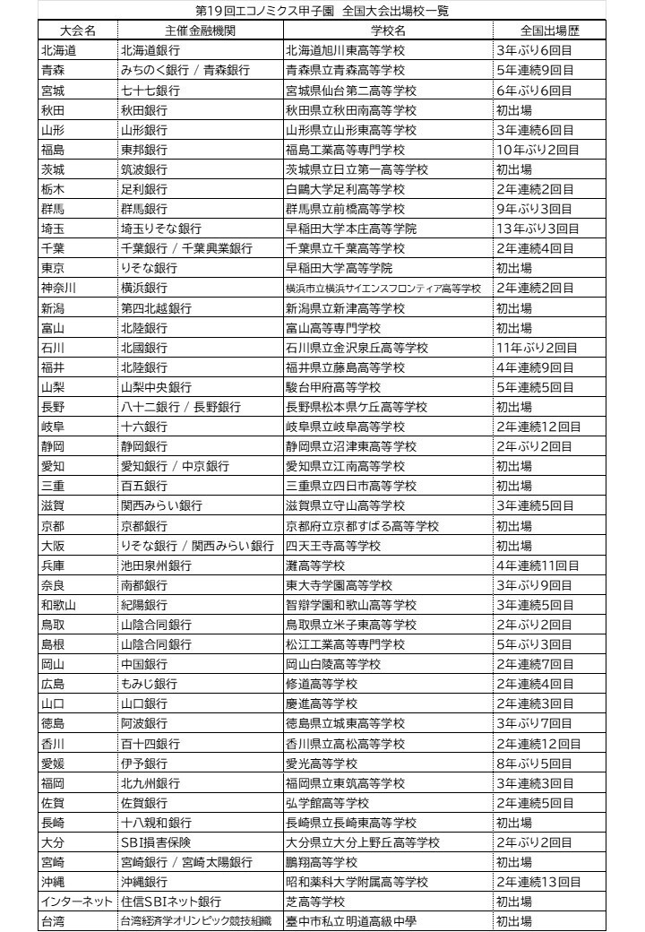 エコノミクス甲子園の各地方大会と全国大会出場校は下記のとおり