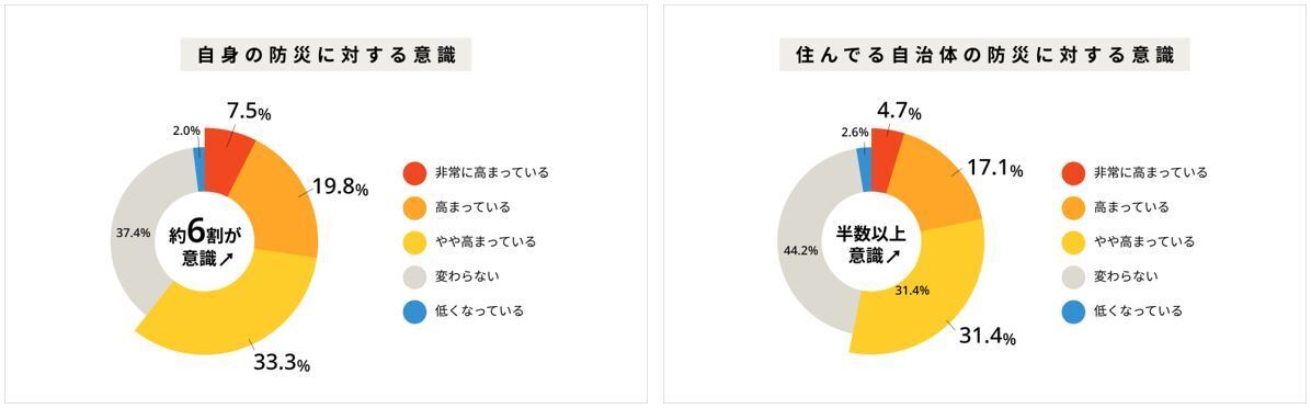 日本は、地震、台風、大雨、津波、火山噴火など、気候や地形によって災害が発生しやすい土地といえます。先日は、南海トラフ地震臨時情報として注意が呼びかけられたほか、台風7号の接近などもあり、より災害を身近に感じた人も少なくはないと思われます。年始に発生した大きな災害の記憶も新しい中、アンケート回答者自身の防災への意識が以前と比べて高まっているかを質問しました。その結果、約6割の人の意識は高まっていることが明らかに。さらに、住んでいる自治体の防災における意識・取り組みに関する質問では、半数以上が高まっていると回答し、回答者自身の意識と近しい結果となりました。意識が「低くなっている」と回答した人はわずかで、災害に対する何かしらの備えが必要であると考える人が多いことが分かりました。