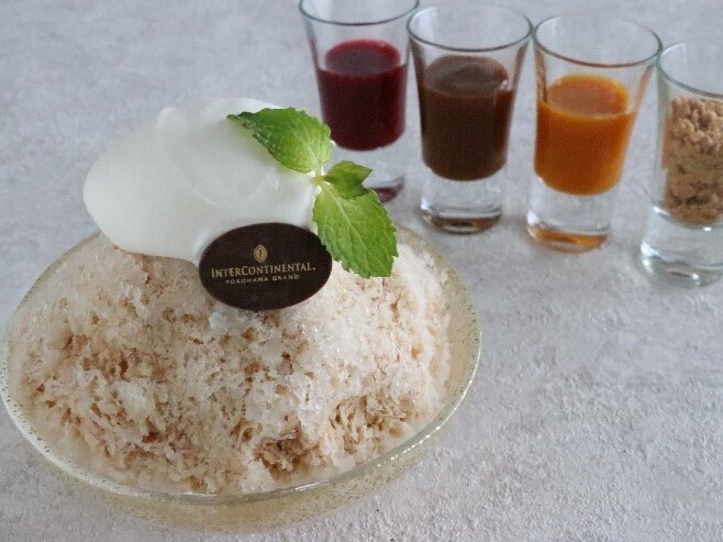 「ロイヤルミルクティー」は、キャラメルフレーバーの紅茶にフレッシュクリームやミルクなどをたっぷりと使ったマリンブルーで人気のロイヤルミルクティーで作った氷を削ってフワフワのかき氷に仕上げられており、中にはホテル自家製のバニラアイスクリームが入っています。