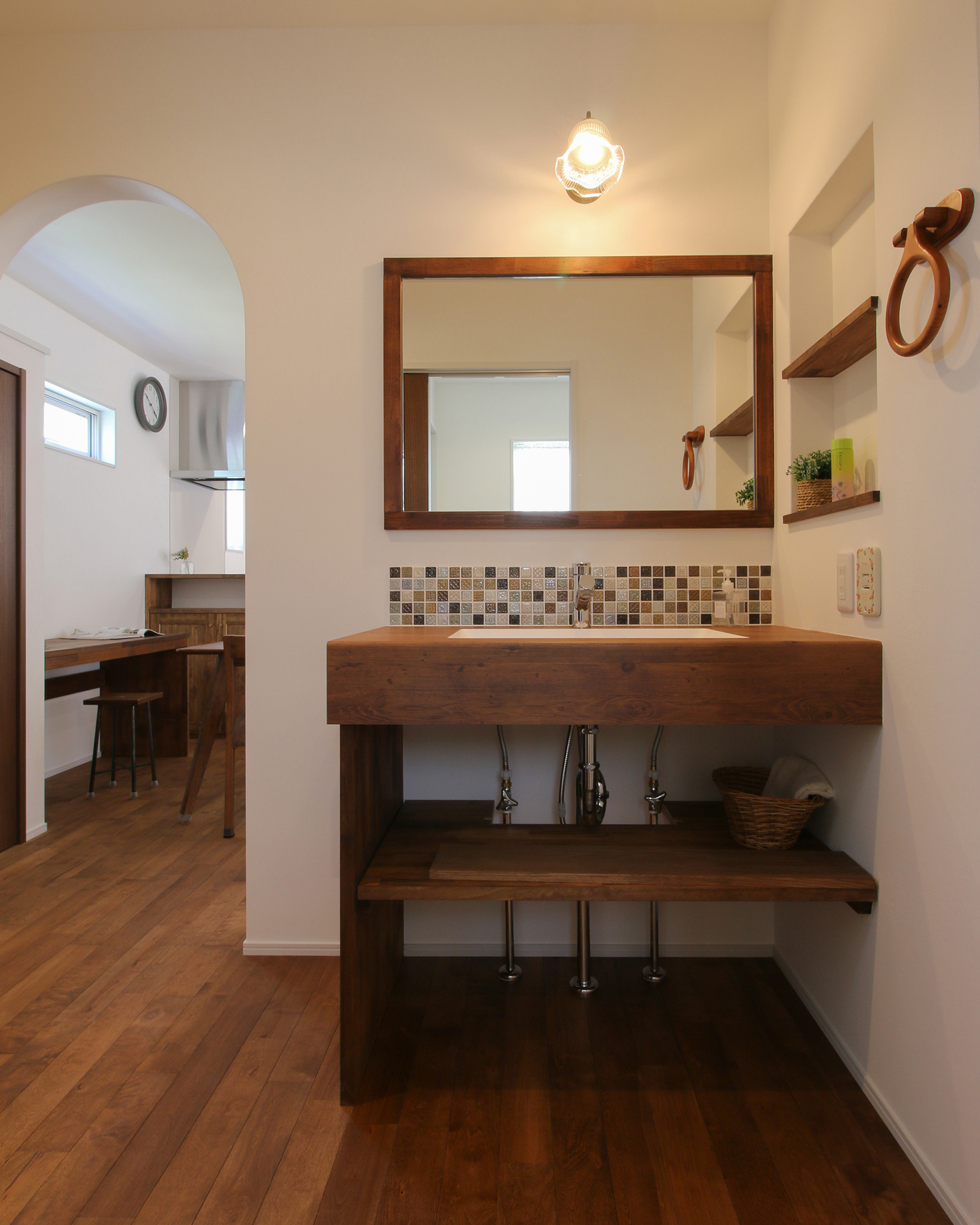 家事をしながら庭やリビングを見渡せて子どもたちを見守れる設計と、アーチの入口や格子の窓、タイルの洗面や照明などおしゃれな演出を実現しています。
