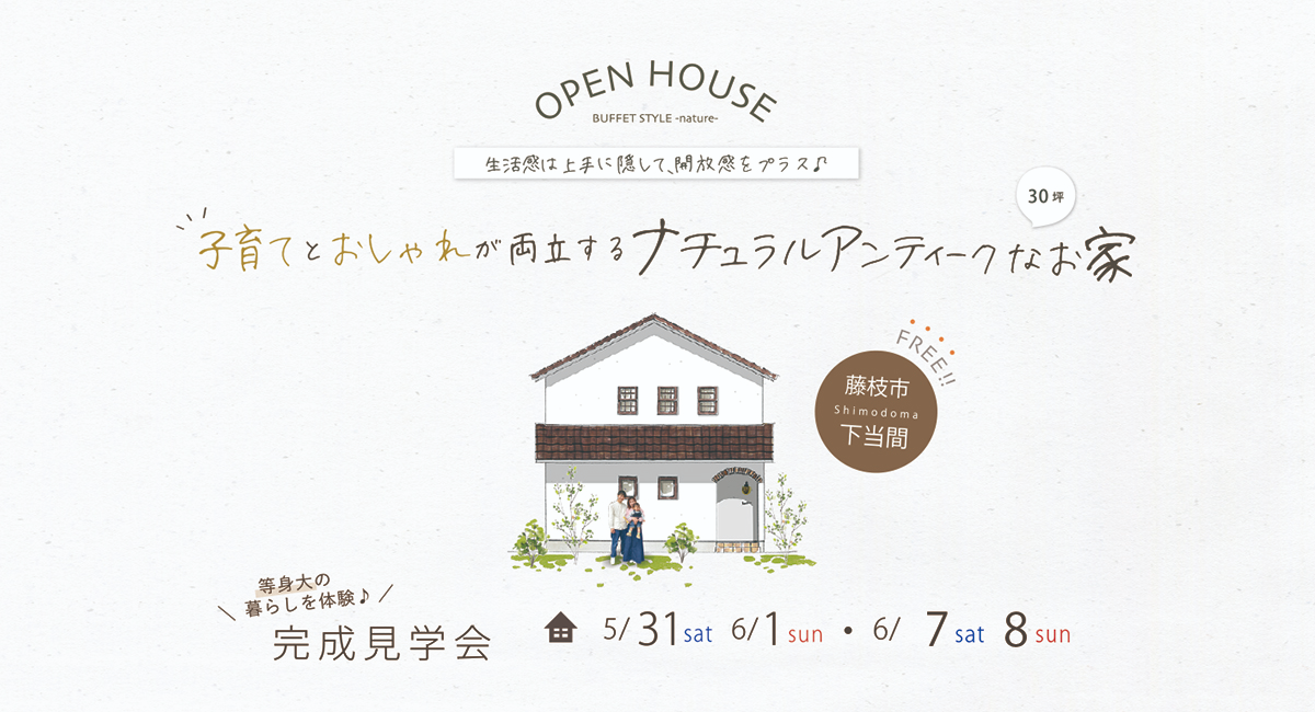 テーマは「子育てとおしゃれが両立するナチュラルアンティークなお家」。生活しやすい間取りと漆喰・無垢床などの無添加素材とW外断熱で“空気のキレイな家づくり”を、モデルハウスではなく実際に暮らす家を見学していただけるチャンスです。