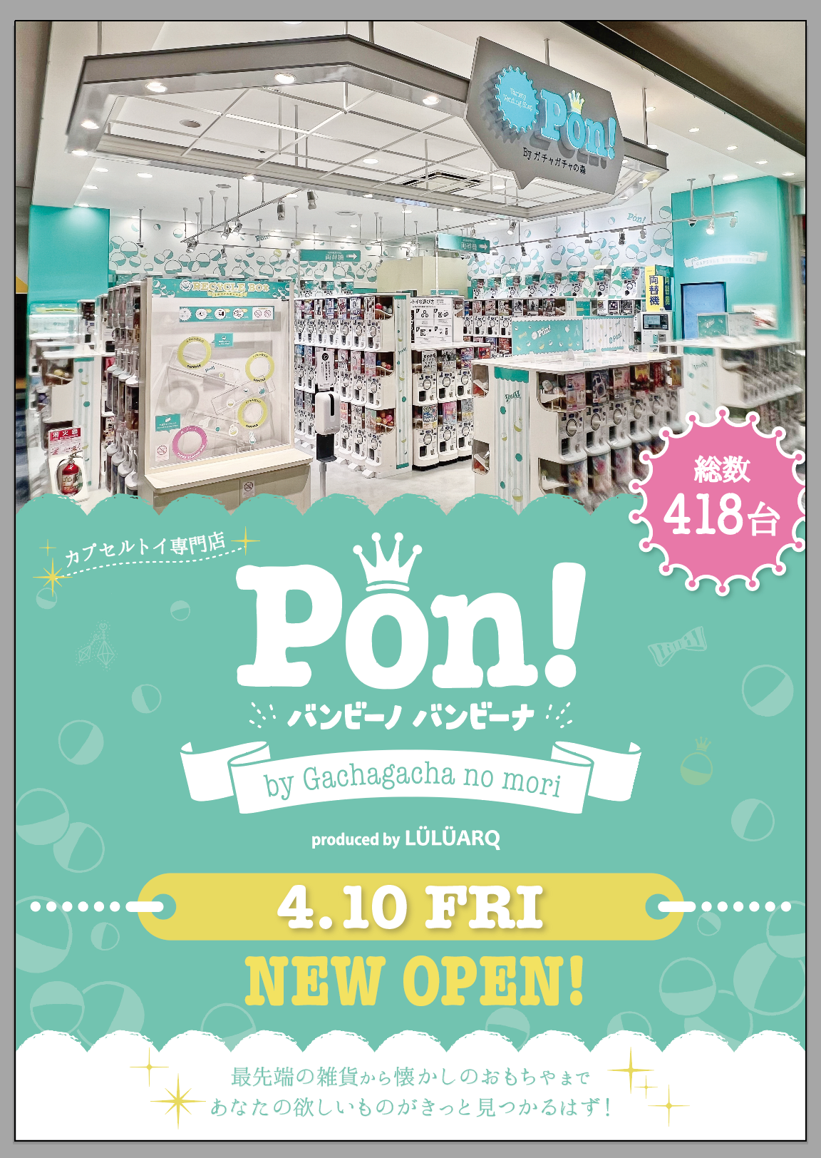 お子様たちの好奇心を刺激し、家族で気軽に楽しめる新しいカプセルトイショップとして、「Pon!」の新たな価値を提案してまいります。
