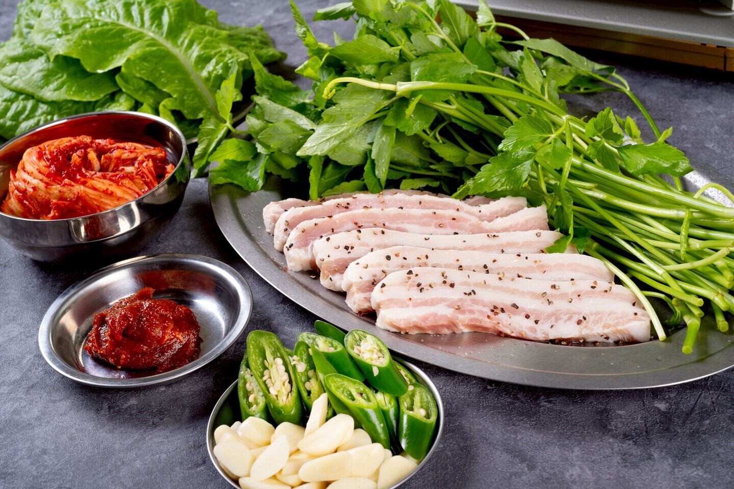 当店は冬の新メニューとして、11月25日(火)から「ミナリサムギョプサル」の提供を開始しました。「ミナリ」とは、春の七草の一つでもある「セリ」のこと。冬に旬を迎える、日本原産の野菜です。爽やかな香りとシャキシャキした歯触りは、厚切りサムギョプサル(豚バラ肉)との相性抜群。一緒に頬張れば、サムギョプサルの脂のうまみがいっそう引き立ちます。セウジョ(エビの塩辛)やゲランド塩、キムチなどの薬味を絡めて、さまざまな食べ方を楽しむのもオススメ。サムギョプサル料理の進化系として韓国でも大人気のメニューです。